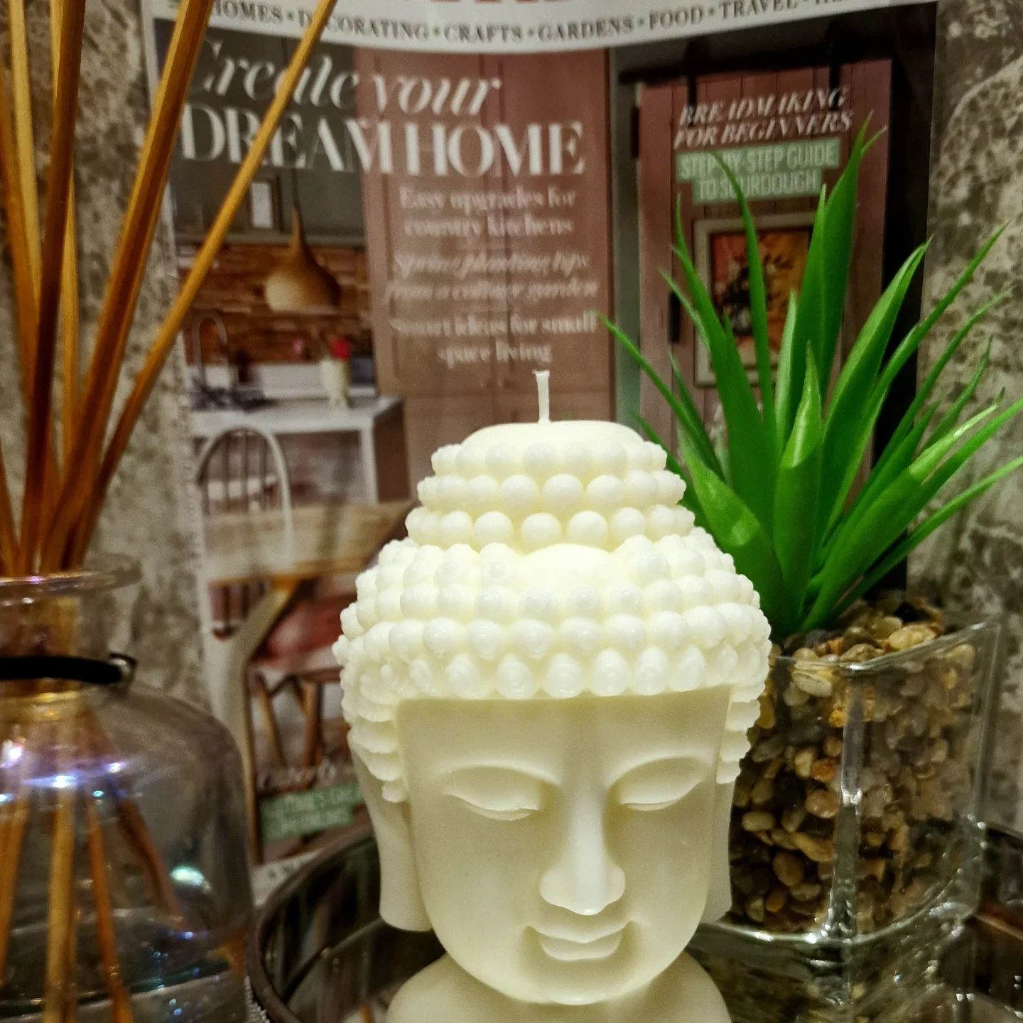 Our handmade Buddha head candle is made of our eco soy wax. This candle is 14cm tall and comes in a white or grey colour.